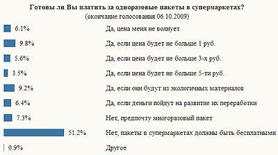 Несколько большее количество читателей нашего портала готовы платить определенную сумму за пакет: 9,8% опрошенных согласны с ценой в 1 рубль, 5,6% - в 3 рубля, и, наконец, 3,5% могут раскошелиться на 5 рублей за пакет. Разброс цен по рынку как раз примерно таков: в «Пятерочке» маленький пакет стоит 1,5 рубля, большой – 3 рубля, в «Перекрестке» за такие же пакеты придется отдать соответственно 90 копеек и 1 р. 80 коп., в гипермаркетах «Карусель» - 2,5 рубля. Переход за пятирублевый барьер воспринимается резко негативно: еще год назад попытка сети «Седьмой континент» заменить дешевые полиэтиленовые пакеты бумажными стоимостью 7 рублей вызвала бурю протестов.