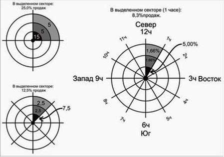 Расположение магазина определяет его судьбу – это общеизвестно. С помощью метода изохрон легко понять, какие перспективы для развития имеются в данном месте, и какой вариант из возможных лучше выбрать для нового магазина. Для этого предлагают использовать методику под названием «часы». На карту района надо наложить кальку, отметить на ней точку расположения магазина и прочертить окружности с предполагаемыми радиусами ближней, средней и дальней торговых зон. Далее полученные окружности делятся на 4 сектора (в зависимости от размера, соотношения торговых зон и степени проработки участка количество секторов может быть 8 или 12). Если магазин имеет идеальное расположение, с жилой застройкой со всех сторон и одинаковой плотностью населения, каждый сегмент ближней зоны будет давать 15 % покупок, средней – 5% (см.рис.6).