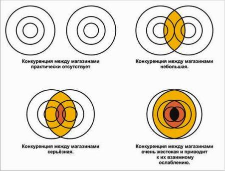 Пересечение торговых зон может привести к сильной конкуренции. Расположенные рядом продовольственные магазины скорее затрудняют друг другу жизнь и, желая побить соседа, могут втянуться в опасную игру снижения цен или размещения на ограниченной площади большого числа позиций ассортимента. Выход из положения магазины могут найти, развивая свои направления специализации или расширяя круг услуг и дополнительных удобств для покупателей.