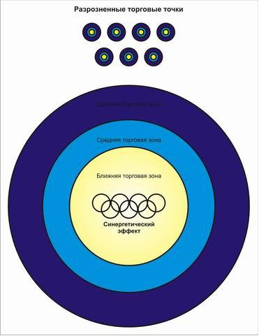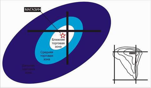 Магазин имеет три торговые зоны, которые определяются по принципу доступности для покупателей: ближняя, средняя и дальняя (см. рис.1.). Для выделения зон используется метод изохрон: учитывается не расстояние до магазина, а время, затрачиваемое покупателями на дорогу. Это метод легко понять, вспомнив армейское «копаем от забора и до обеда». Изохроны объединяют точки равной временной доступности для пешеходов или автомобилистов, например, все точки, из которых можно попасть в магазин за 10 минут. Поэтому в реальности торговые зоны представляют собой сложные криволинейные фигуры. На размеры каждой зоны или всей области торговли влияют такие барьеры как река, гора, железная дорога, овраг, склады или район с высоким уровнем преступности. Зависят размеры зон и от типа магазина, качества и ассортимента предлагаемого товара: у обычных продовольственных магазинов область торговли не превышает 1,5 км в диаметре, в то время как крупные специализированные магазины могут охватывать площадь с радиусом более 20 км. Эмоциональное восприятие также играет роль: привлекательные магазины кажутся расположенными ближе, чем на самом деле, а приятная дорога - намного короче.