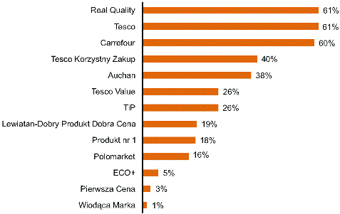 Самыми узнаваемыми private labels в Польше являются Tesco (одноименная сеть супер- и гипермаркетов) и Real Quality (сеть гипермаркетов Real), которые упоминают более 60% респондентов. Ровно 60% опрошенных знают также собственную торговую марку Carrefour, а 40% - еще одну СТМ сети Tesco - Korzystny Zakup (Полезная Покупка), - об этом свидетельствуют результаты общепольского исследования, проведенного компанией PMR Research.