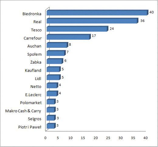 40% поляков наиболее часто совершают покупки продуктов питания в магазинах сети Biedronka, 36% - в гипермаркетах Real, 24% - в Tesco. Таковы результаты нового исследования, проведенного компанией PMR Research.