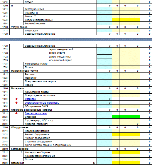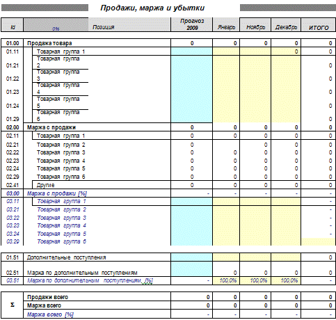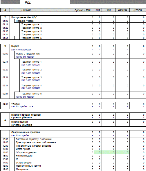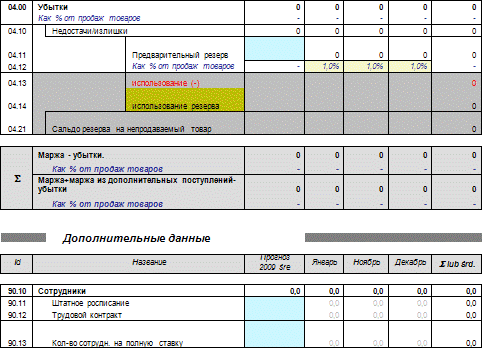 Лист «ПРОДАЖИ, МАРЖА и УБЫТКИ» - самый трудный участок работы. Показатели данной таблицы очень тяжело спрогнозировать, а их влияние на Результат Нетто и EBITDA очень велико. На основании данной информации можно проводить анализ продаж с одного квадратного метра каждой группы товара и тем самым «чувствовать» эффективность каждого квадратного сантиметра и каждой полки магазина.