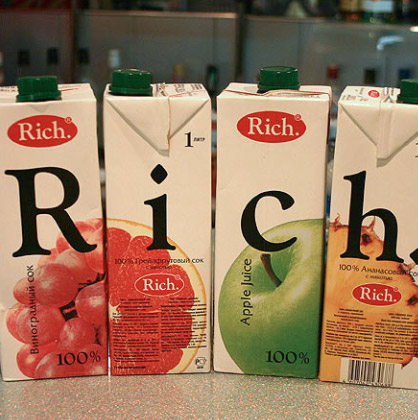 3. Выделить свою упаковку на фоне упаковок конкурентов. Яркий пример — соки Rich вышли в белом, пока другие соки эксплуатировали многоцветье. При этом марка использовала прием «дробления своего названия» на несколько упаковок. Таким образом, подсознательно «прося» персонал магазина — соберите ребус из 4-х букв (см. рис. 2). А как приятно было потребителю этот ребус решать… Он же возбужден, он же как в «Веселых картинках» в детстве — смог угадать слово!