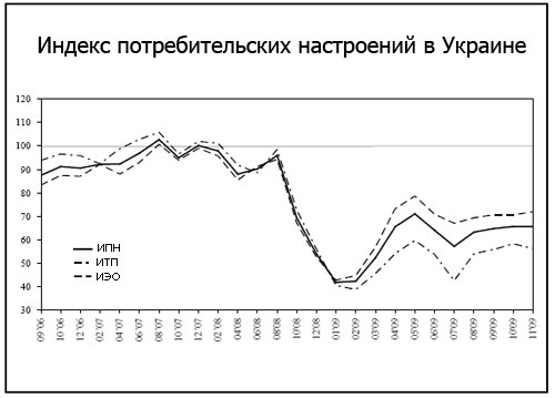 В ноябре 2009 года в Украине индекс потребительских настроений (ИПН) замер на уровне октябрьского значения в 65,6 накануне новогодних праздников. Такая ситуация сложилась благодаря взаимоуравновешенному влиянию двух факторов: оценок индекса текущего положения (ИТП), который ухудшился на 2,1 пункта до 56,2, и индекса экономических ожиданий (ИЭО), который наоборот вырос на 1,3 пункта и составил 71,9.