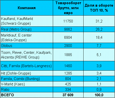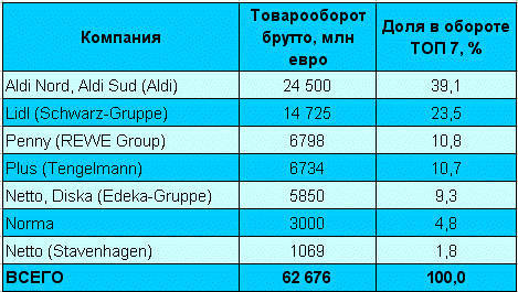 В сегменте дискаунтеров суммарный товарооборот 7 крупнейших компаний составляет более 62 млрд евро. Лидером, как и раньше, остается сеть Aldi, опережающая Lidl, Penny и Plus. Что касается магазинов форматов «гипермаркет» и «супермаркет», то здесь обороты 10 самых больших розничных фирм составляют в сумме 37 млрд евро. Лидерами среди таких компаний являются Schwarz, Metro и Edeka.