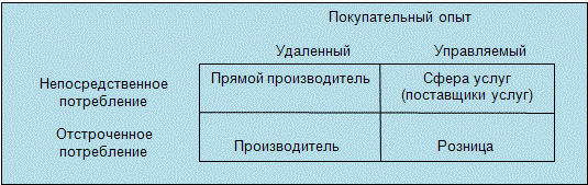 Компании с высоким уровнем контроля (управления) покупательным опытом — это те фирмы, которые находятся много ближе к потребительскому краю цепи поставки. Компании этого типа, имеющие дело прежде всего с непосредственным потреблением, известны как поставщики услуг, тогда как те, что имеют дело с отсроченным потреблением, — это предприятия розничной торговли. Примером поставщика услуг, согласно этому определению, будет кинотеатр, а розничным предприятием, работающим в том же секторе, будет магазин видеокассет (в основном торгующий, а не выдающий кассеты напрокат).