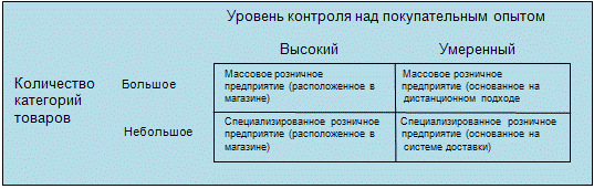Розничные предприятия с высоким уровнем покупательного контроля — это обычно те, которые используют методику продаж через магазин. Высокий уровень контроля в этом случае проистекает из возможности разработать автономную среду продаж, которая дает покупателю весьма определенный опыт совершения покупок. Розничные предприятия с более умеренным уровнем покупательного контроля, как правило, используют дистанционный подход, при котором физический контакт между покупателем и розничным предприятием ограничен. Примерами розничных предприятий этих типов будут, соответственно, магазин одежды (высокий уровень контроля) и, в том же самом секторе, каталог одежды, или онлайновое розничное предприятие (умеренный уровень контроля). Розничные предприятия, предлагающие большое количество различных категорий товаров, относятся к массовым розничным предприятиям, те же, что предлагают небольшое количество различных категорий, — к специализированным. Если использовать те же примеры, то универмаг представляет массовое розничное предприятие (расположенное в магазине), каталог одежды для массовой аудитории или онлайновое розничное предприятие будут массовыми предприятиями (основанными на системе доставки), магазин одежды высокой моды является специализированным розничным предприятием (расположенным в магазине), а каталог или онлайновое розничное предприятие, продающее только конкретные виды одежды - специализированным розничным предприятием (основанным на системе доставки).