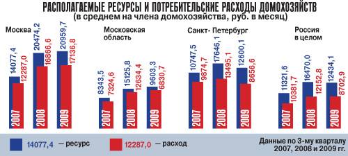 Абсолютно иная картина сложилась в 2009 году. Москвичи даже в кризис умудрились сэкономить на 0,77% больше, чем в 2008 году, жители области — на 0,21%, в то время как россияне в среднем потратили на 1,85% больше прежнего. Санкт-Петербург и здесь отличился: в карманах питерских семей осталось на 16,61% меньше, чем в 2008 году, а общий уровень благосостояния вернулся к 2007 году.