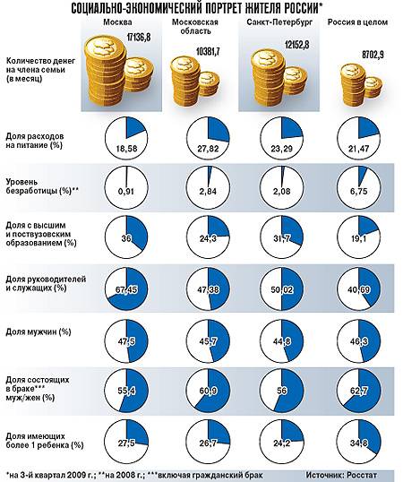 С образованием у москвичей тоже все в порядке: доля имеющих высшее (включая неполное высшее) и послевузовское образование составляет 36%. Среди петербуржцев таковых 31%, в Московской области — менее 25%, а в среднем по России среди “шибко умных” — почти каждый пятый.