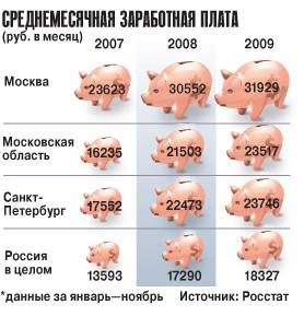 Занятно, что зарплата москвичей росла не самыми высокими темпами: в 2008 году она выросла на 29,33% относительно 2007 года, в 2009-м — на 4,5%. Здесь лидер группы Подмосковье: 32,45 и 9,37% соответственно. В Санкт-Петербурге рост зарплат в 2008 году был на втором месте (28,04%, по России в среднем — 27,2%), а в 2009 году упал ниже среднероссийского уровня (5,66 против 6%).
