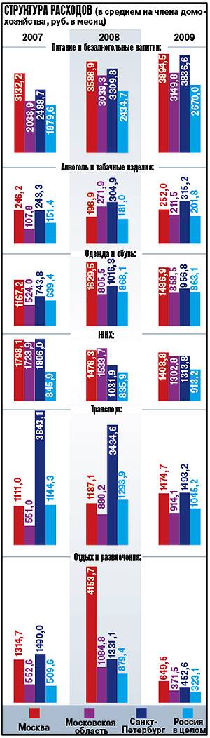 Не менее интересна структура потребительских расходов. Так, изучая расходы на алкоголь и табак, можно увидеть, что москвичи отреагировали на кризис совершенно иначе, нежели остальные жители России. Так, по России в целом эти расходы в 3-м квартале 2008 года выросли: 181 руб. на человека против 151,4 руб. в 3-м квартале 2007 года. Питер и Подмосковье отреагировали аналогично: соответственно 304,9 руб. против 243,3 руб. и 271,9 руб. против 107,8 руб. А вот москвичи пить стали явно меньше: в 3-м квартале 2008 года они потратили на алкоголь и табак 196,9 руб. на человека против 246,2 руб. в аналогичный период 2007 года.