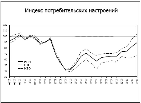 Как и в прошлом месяце, основным источником улучшения были экономические ожидания потребителей. Соответствующий индекс (ИЭО) добавил 8,7 пункта и пересек границу оптимизма, достигнув значения 104,3. Оценки текущего состояния (ИТП) - другой составляющей ИПН - также улучшились на 3,6 пункта, однако остаются на достаточно низком уровне, на что указывает значение ИТП в 66,9 пункта.