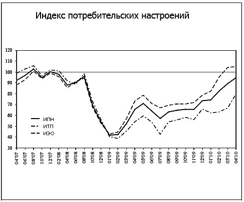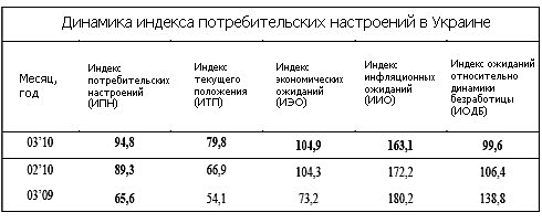 Благодаря росту индекса потребительских настроений в апреле 2010 года на 5,5 пункта он достиг значения 94,8, вплотную приблизившись к границе оптимизма (см. Таблицу 1). Таким образом, еще лишь нескольких пунктов не хватает оптимистично настроенным украинцам для того, чтобы оказаться в большинстве.