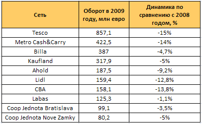 В 2009 году розничный товарооборот в Словакии впервые за 10 лет показал отрицательную динамику – он снизился приблизительно на 10%. Самые катастрофические показатели первая десятка ритейлеров зафиксировала в первом квартале прошедшего года, когда их продажи упали на 25%. В следующие месяцы ситуация немного стабилизировалась. Больше всего потеряли лидеры словацкого розничного рынка – Tesco (-15%) и Metro Cash&Carry (-14%).