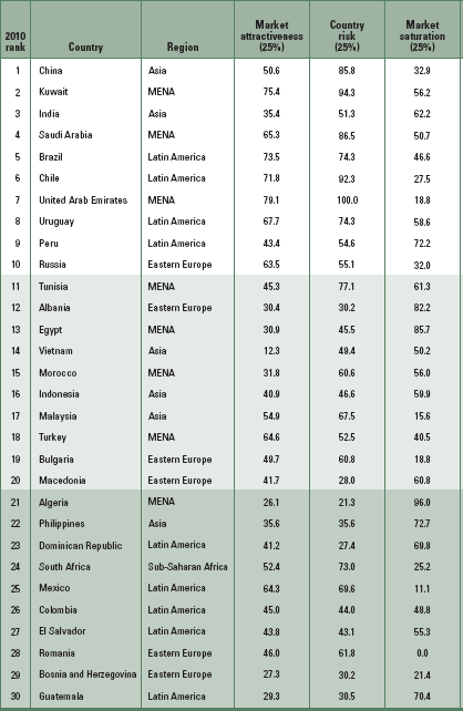 Индия в 2010 году опустилась с первого на третье место в рейтинге. Здесь по-прежнему ожидается рост, однако слишком большое количество иностранных игроков ограничило число и сделало дороже земельные участки и недвижимость, а инвестиционные ограничения повысили уровень насыщенности рынка.