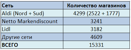 В целом, по состоянию на февраль 2010 года, в Германии действовало уже более 15 300 магазинов формата «дискаунтер».