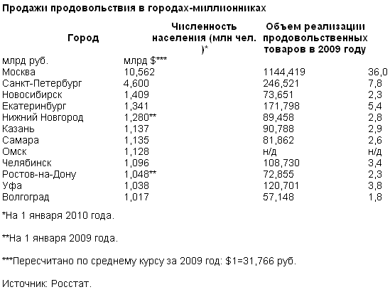 По итогам 2009 года рынок продовольственных товаров в России оценивается в 6,425 трлн руб. Самые большие рынки — в Центральном и Приволжском федеральных округах (2,176 трлн и 1,153 трлн руб. соответственно), наименьший — в Дальневосточном округе (279 млрд руб.). На продовольственный рынок Москвы приходится 17,8% (1,144 трлн руб.) всех продаж, что примерно в пять раз больше показателя Санкт-Петербурга (246 млрд руб.; см. таблицу).