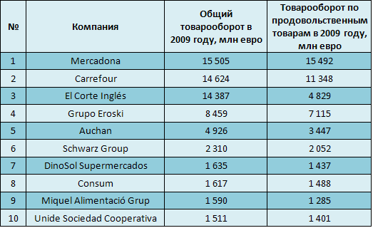 Компания Planet Retail представила общественности рейтинг десяти крупнейших торговых сетей Испании по итогам 2009 года. Публикуем его Вашему вниманию.