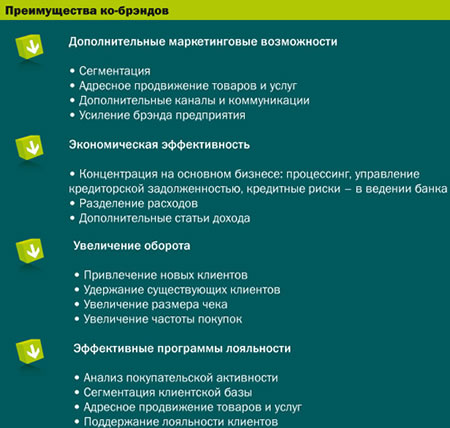 Участие в ко-брэндовой программе выгодно для каждого партнера. Торговая точка благодаря расширенным возможностям ко-брэнда повышает лояльность покупателя, получает дополнительные маркетинговые и коммуникационные каналы — сегментация клиентов, адресное продвижение товаров и услуг, усиление брэнда. Преимущество для банка и платежной системы заключается в увеличении продаж и привлечении новых клиентов. При этом и ритейлер, и банк, и платежная система имеют доступ к базам данных о клиентах друг друга — о размере среднего платежа в сети партнера, количестве, структуре, частоте и регулярности покупок, что также очень немаловажно.