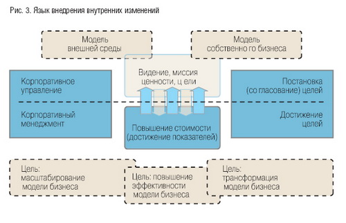 Для того чтобы цели соответствовали вызовам, их формирование и реализация должны производиться на языке, одинаково понятном на всех уровнях управления. Нужно, чтобы такой язык позволял описывать изменения внутри компании и связывать их с изменениями внешней среды. Уже общим стало правило «или быстрый, или мертвый». Язык должен позволять бизнесу вовремя улавливать и описывать внешние изменения с тем, чтобы описывать и внедрять внутренние изменения. Составляющие элементы такого языка приведены на рисунке 3.