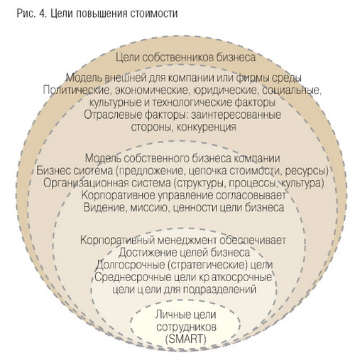 Цель любого коммерческого предприятия — повышение стоимости. Однако сформулированная «вообще» эта цель не может быть ни поставлена, ни измерена, ни донесена до заинтересованных сторон. Уточнение этой цели в разных временных горизонтах, ее привязка к модели внешней среды и собственной бизнес-модели делают цели повышения стоимости конкретными, измеримыми, достижимыми, реалистичными и ранжированными по времени (SMART, рисунок 4).