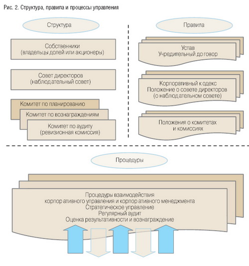 Система корпоративного управления представляет собой структуру, правила и процессы управления (рисунок 2). Структура позволяет выстроить иерархию и разделить функции между участниками, правила — зафиксировать принципы работы системы. Процедуры формализуют алгоритмы действий участников и взаимодействия систем корпоративного управления и корпоративного менеджмента.