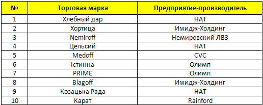 Исследовательская компания MEMRB-IRI огласила данные по самым популярным в Украине водочных торговых марках. Так, в первой десятке самых продаваемых брендов находится сразу три марки, производимые компанией «Национальные алкогольные традиции» - «Хлебный дар», «Цельсий» и «Козацька Рада». Первую тройку лидеров составляют ТМ «Хлебный дар», «Хортица» и Nemiroff.