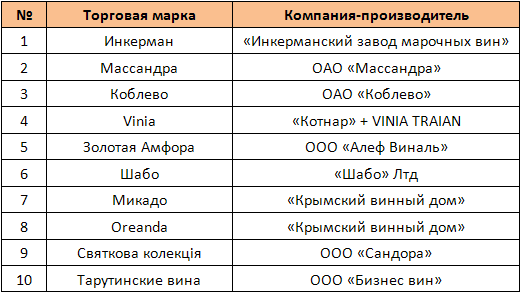Партнер портала All Retail, компания MEMRB-IRI, предоставила данные по самым популярным винным брендам в канале современной торговли. Первое место рейтинга удерживает ТМ «Инкерман» производства одноименного завода марочных вин. На втором месте следует ТМ «Массандра», на третьем – ТМ «Коблево». В целом, наиболее широко в рейтинге представлен «Крымский винный дом», две торговые марки которого («Микадо» и Oreanda) расположились на седьмом и восьмом местах соответственно.