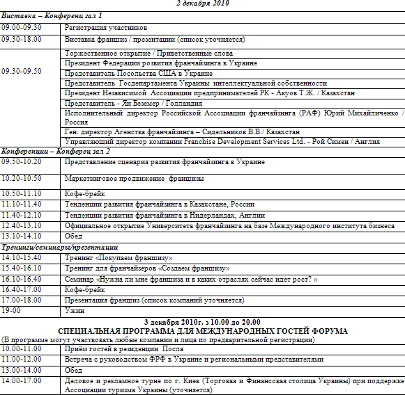 «Федерация развития франчайзинга, гостеприимства и инфраструктуры» при поддержке Американской Коммерческой Службы при Посольстве США в Украине Американской Торговой палаты и Государственного Комитета Украины по вопросам регуляторной политики и предпринимательства приглашает Вас принять участие в Первом Международном Форуме по франчайзингу, который состоится 2-3 декабря 2010  в г. Киев
