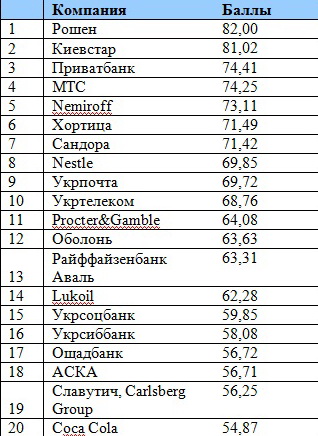 В пятерку компаний с самым высоким уровнем репутации также вошли «Киевстар» (81,02), «Приватбанк» (74,41), МТС (74,25) и Nemiroff (73,11).