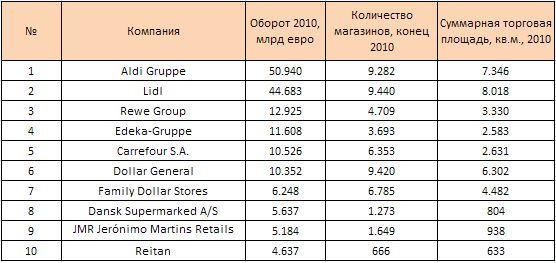 Приводим Вашему вниманию список десяти крупнейших операторов дискаунтеров мира, подготовленный компанией Planet Retail. Как и в прошлом году, лидером рейтинга осталась немецкая компания Aldi Gruppe, развивающая сеть одноименных магазинов. В  целом, первая четверка рейтинга целиком составлена из представителей Германии.