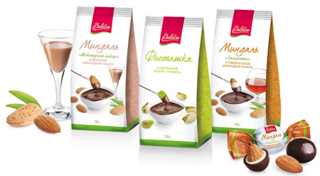 Ассортимент: фисташка с глазури «Трюфель», фундук в молочной шоколадной глазури; вишня в шоколадной глазури; миндаль «Шоколадный ликер» в молочной шоколадной глазури, миндаль «Амаретто» в темной и белой шоколадной глазури и пр. Продукция представлена в упаковке от 120 г .
