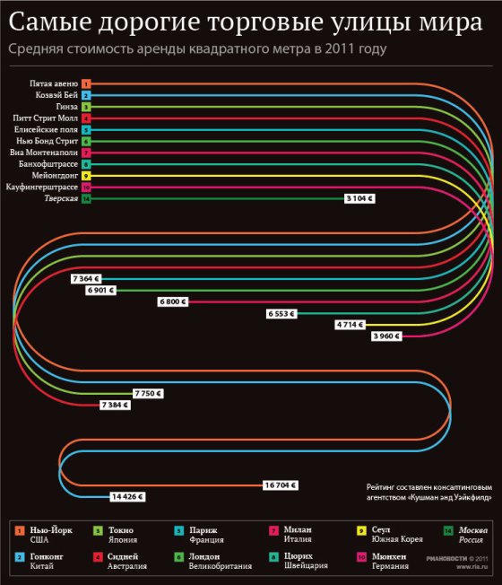 Почти вдвое меньше платят за аренду торговых площадей владельцы магазинов, расположенных на улице Гинза в Токио - 7 711 евро за кв. м и на Нью Бонд Стрит в Лондоне - 7 345 евро за кв. м.