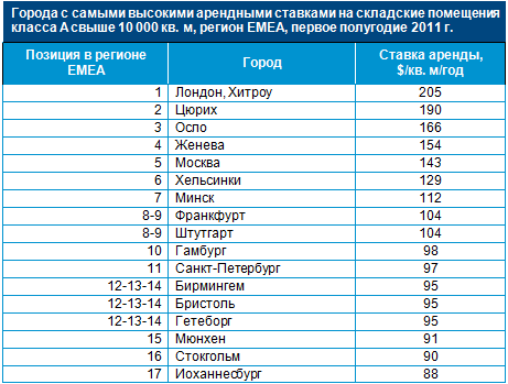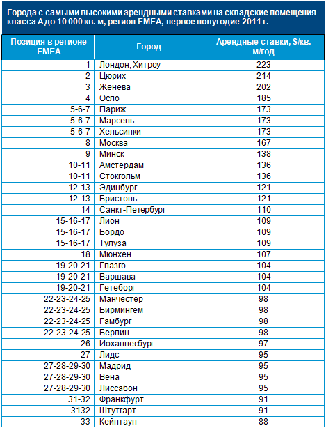 По итогам первого полугодия 2011 г. отмечалась стабилизация арендных ставок в сегменте складских помещений класса А с наиболее удачным расположением площадью до 10 000 кв. м в большинстве исследуемых городов. Это стало следствием недостатка предложения качественной складской недвижимости и ограниченного объема нового строительства в этих городах, даже несмотря на невысокий уровень спроса, который обусловлен неблагоприятными макроэкономическими ожиданиями арендаторов.
