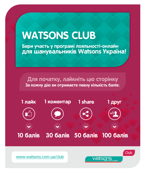Онлайн программа лояльности Watsons Club + - это специально написанное приложение для социальной сети Facebook, которое позволяет поощрять активистов страницы с помощью дополнительных бонусных баллов. Для того, чтобы стать пользователем онлайн программы лояльности, необходимо быть участником Watsons Club, а также фаном страницы Watsons Украина в социальной сети Facebook.