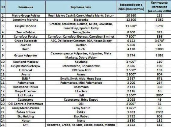 По результам прошлого года лидером оказалась группа Metro, которая развивает в Польше сеть гипермаркетов Real, центров оптовой торговли Makro Cash & Carry ,а также магазины электроники и бытовой техники MediaMarkt и Saturn. Выручка компании в сравнении с 2007 годом возросла на 35% и составила почти 21 млрд злотых.