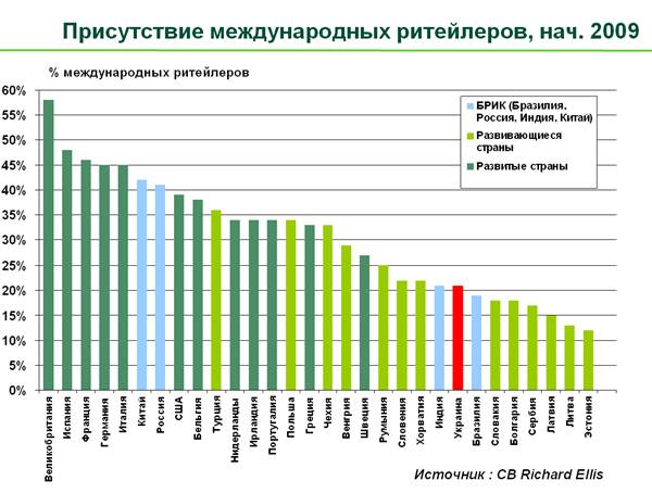 Украина в рейтинге стран, ставших наиболее привлекательными для экспансии ритейлеров в 2008 году, заняла 12 место. Более того, как показали результаты опроса среди 300 ритейлеров, проведенного компанией CB Richard Ellis в 2008 году в рамках исследования Global Emerging Markets Survey, интерес к Украине достаточно высок: 63% опрошенных операторов потенциально рассматривали или рассматривают выход на Украину. В то же время, у Украины, в соответствии с результатами опроса, достаточно высокий уровень отказов от развития после изучения рынка, – порядка 16%. Для сравнения, решение о выходе оператора в Китай практически всегда ведет к открытию там магазинов, т.е. уровень отказа близок к 0%, в то время как данный показатель для Пакистана составляет (38%).
