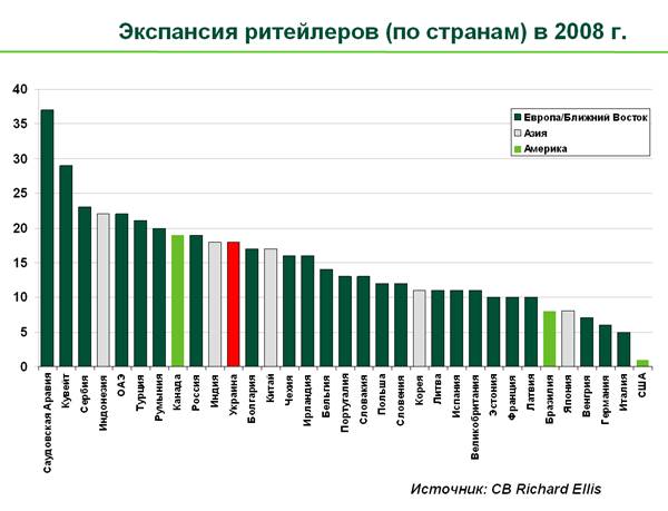 Опрос 300 международных ритейлеров показал, что многие операторы в 2008 году продолжили активную экспансию, несмотря на экономический кризис. В основном экспансия проходила за счет развивающихся стран. В рейтинге стран, ставших наиболее привлекательными для экспансии ритейлеров в 2008 году, Украина заняла 12 место. Таковы результаты ежегодного исследования компании CB Richard Ellis