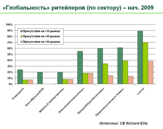 В отчете CB Richard Ellis проанализированы изменения, которые произошли со времени проведения аналогичного опроса в 2008 году. За последний год ритейлеры расширили свою глобальную деятельность на 12%, увеличив зону присутствия в среднем на 2 страны.