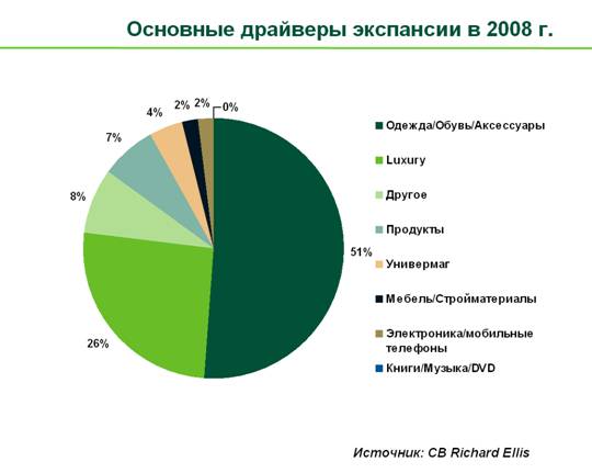 Наиболее активно в 2008 году развивались европейские операторы сегментов luxury и фэшн-ритейла (главным образом из Италии, Франции, Великобритании и Испании). На долю фэшн-ритейла пришлось около 51% от общего числа магазинов, открытых ритейлерами за пределами «родного» рынка в 2008 г. В то же время, результаты проведенного исследования свидетельствуют, что наиболее «глобальными» с точки зрения присутствия на мировых рынках являются ритейлеры сегмента luxury. С точки зрения присутствия операторов сегмента luxury Киев занимает 55 место в рейтинге, — около 30% международных ритейлеров данного сегмента осуществляют свою деятельность в Киеве.