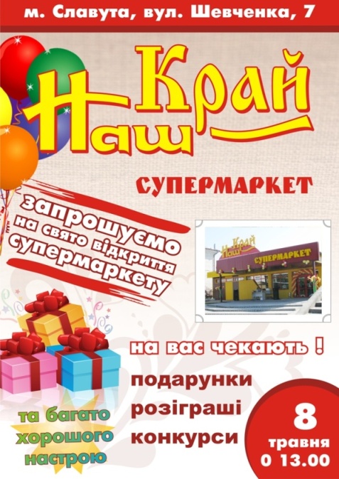 Сегодня, 8 мая, в г. Славута (Хмельницкая область) состоится повторное открытие магазина "Наш Край". Супермаркет расположен по адресу площадь Шевченка, 7, его торговая площадь - 380 кв.м.