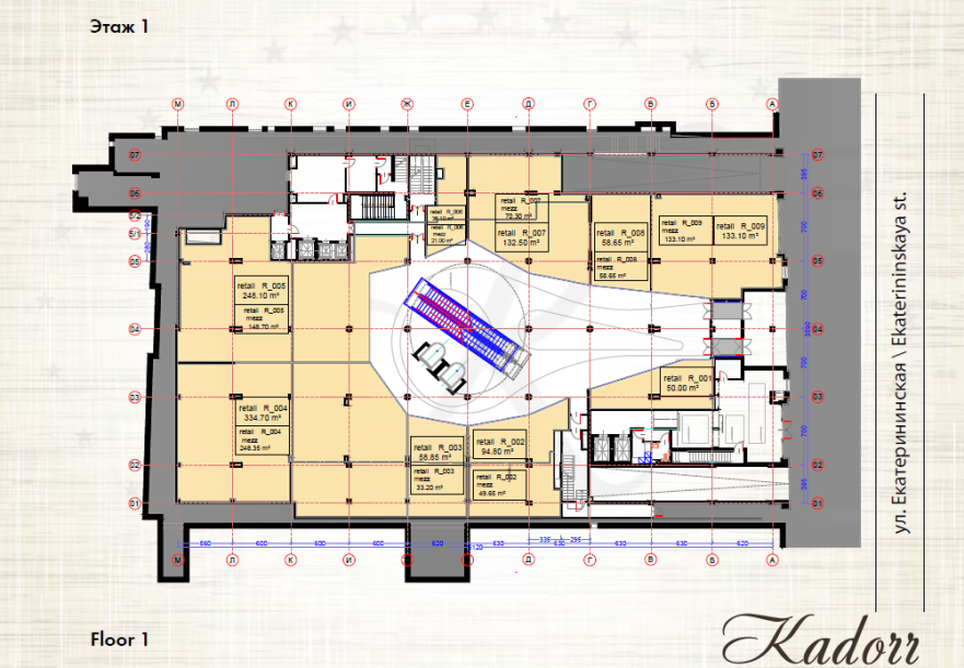В торговой галерее ТЦ "Кадорр" будет находится около 90 магазинов. В частности, на -1 этаже ожидается открытие продуктового супермаркета площадью 600 кв.м. Информации о будущем арендаторе пока не нет.