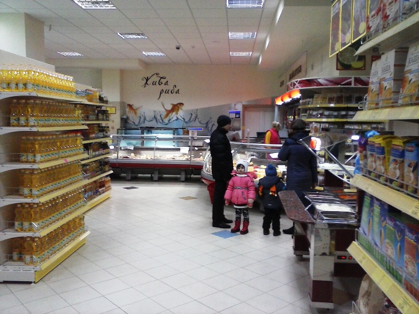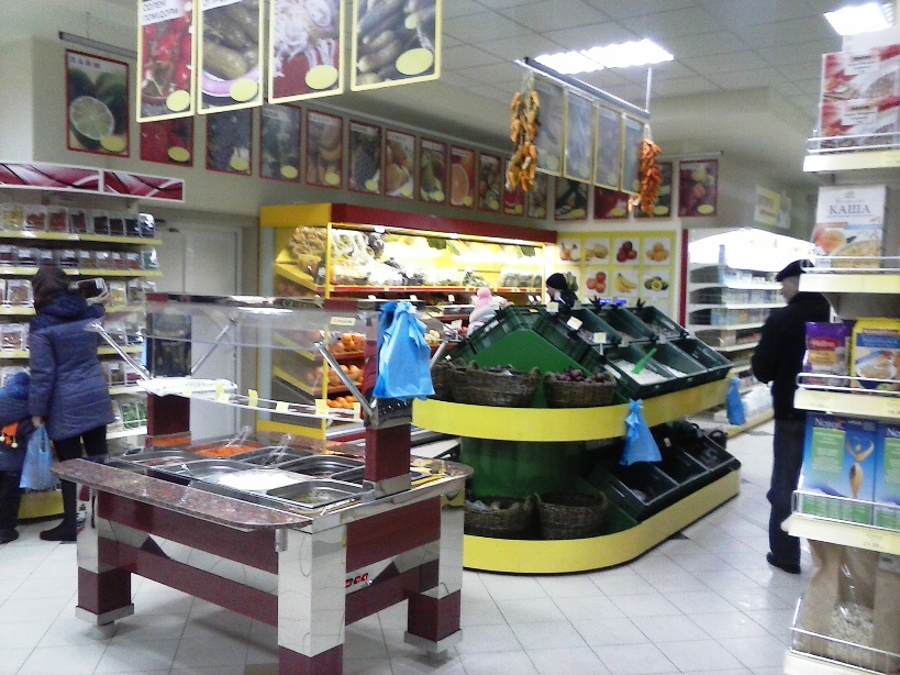 Супермаркет торговой площадью 500 кв.м. (4 кассы) предлагает своим посетителям широкий ассортимент качественных мяса, живой и замороженной рыбы, деликатесов, овощей и фруктов, сухофруктов, кондитерских изделий, чая и кофе фасованных и весовых, бакалейных продуктов и товаров бытовой химии.