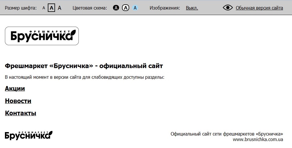 В последнее время на горячую линию торговой сети «Брусничка» поступило большое количество обращений с просьбами создать альтернативную версию сайта, из которой люди с проблемами зрения смогут получать важную информацию о компании, ее новостях и еженедельных ценовых акциях. Заботясь о комфорте своих клиентов, руководство компании приняло решение воплотить данный проект.