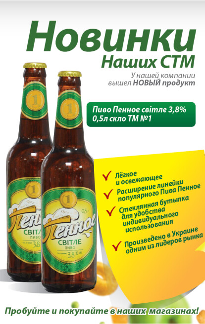 Ассортиментную линейку алкогольных напитков компании пополнило пиво светлое под ТМ "Пиво Пенное №1". Пиво разлито в стеклянные бутылки объемом 0,5л, содержание алкоголя 3,8%. Пиво производится специально по заказу сети одним из крупнейших производителей пива, компанией «Оболонь».
