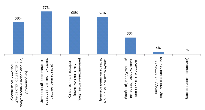 Так, для 77% женщин важен интересный ассортимент товаров, а для 70% мужчин — качество, но и ассортимент товара на выбор любимого магазина играет далеко не последнюю роль для  69% сильного пола.
