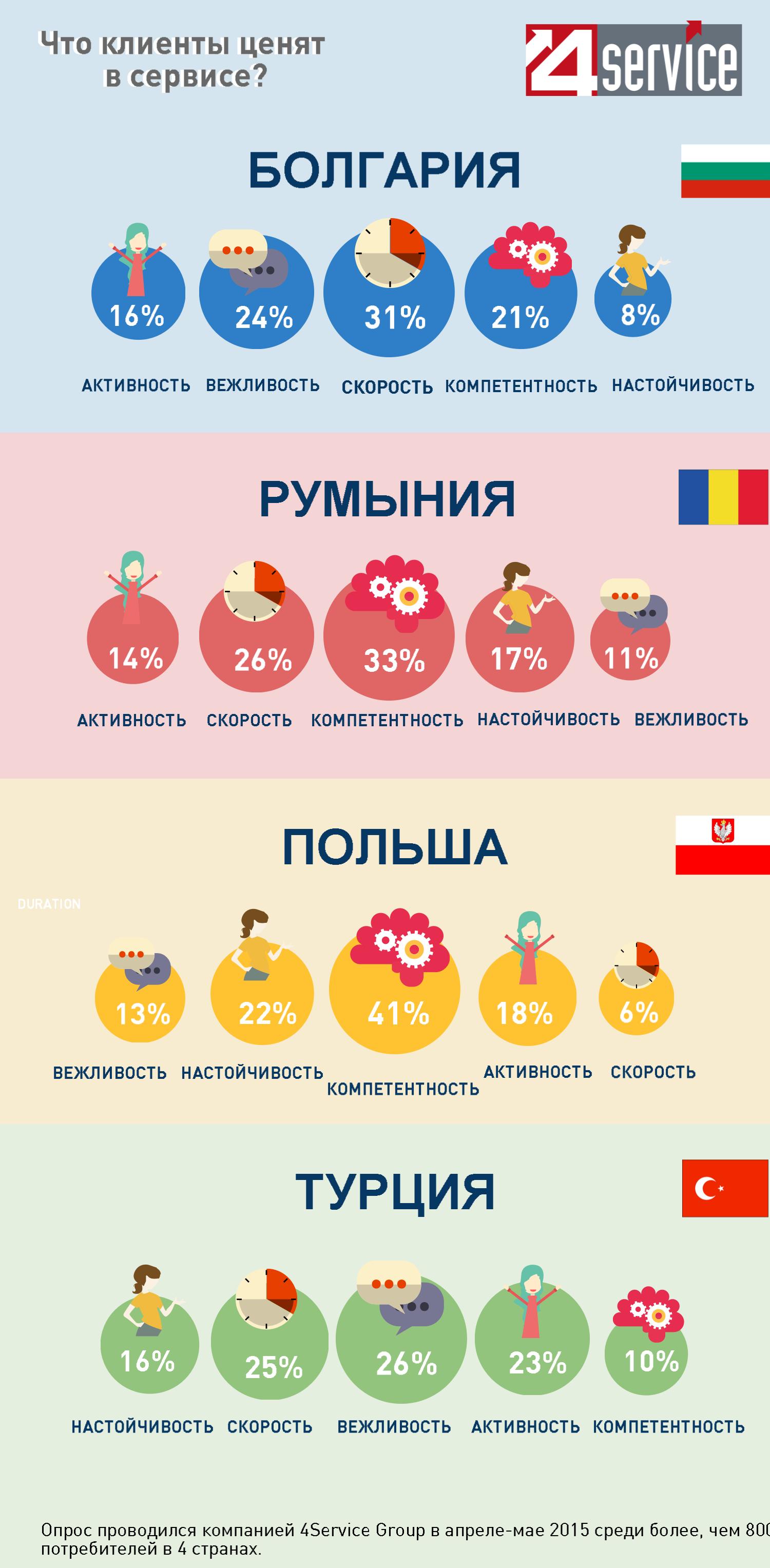 Результаты опроса 4Service, в котором приняли участие потребители из Румынии, Болгарии, Польши и Турции, выявили следующие межкультурные различия: