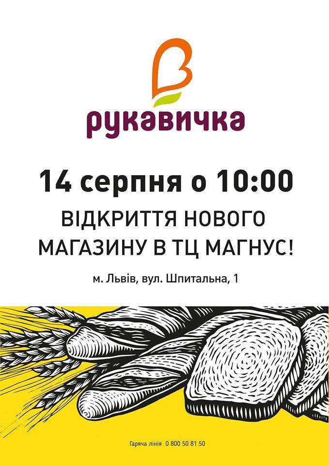 14 августа 2015 компания «Львовхолод» откроет магазин «Рукавичка» в самом сердце Львова - в торговом центре «Магнус». Магазин будет расположен неподалеку Львовской оперы, на первом этаже ТЦ, расположенного по адресу ул. Шпитальная, 1. Запуск объекта позволил создать 46 новых рабочих мест. В целом, это будет уже 88-ая «Рукавичка» в составе этой сети и 11-ый объект ритейлера, открытый с начала текущего года.