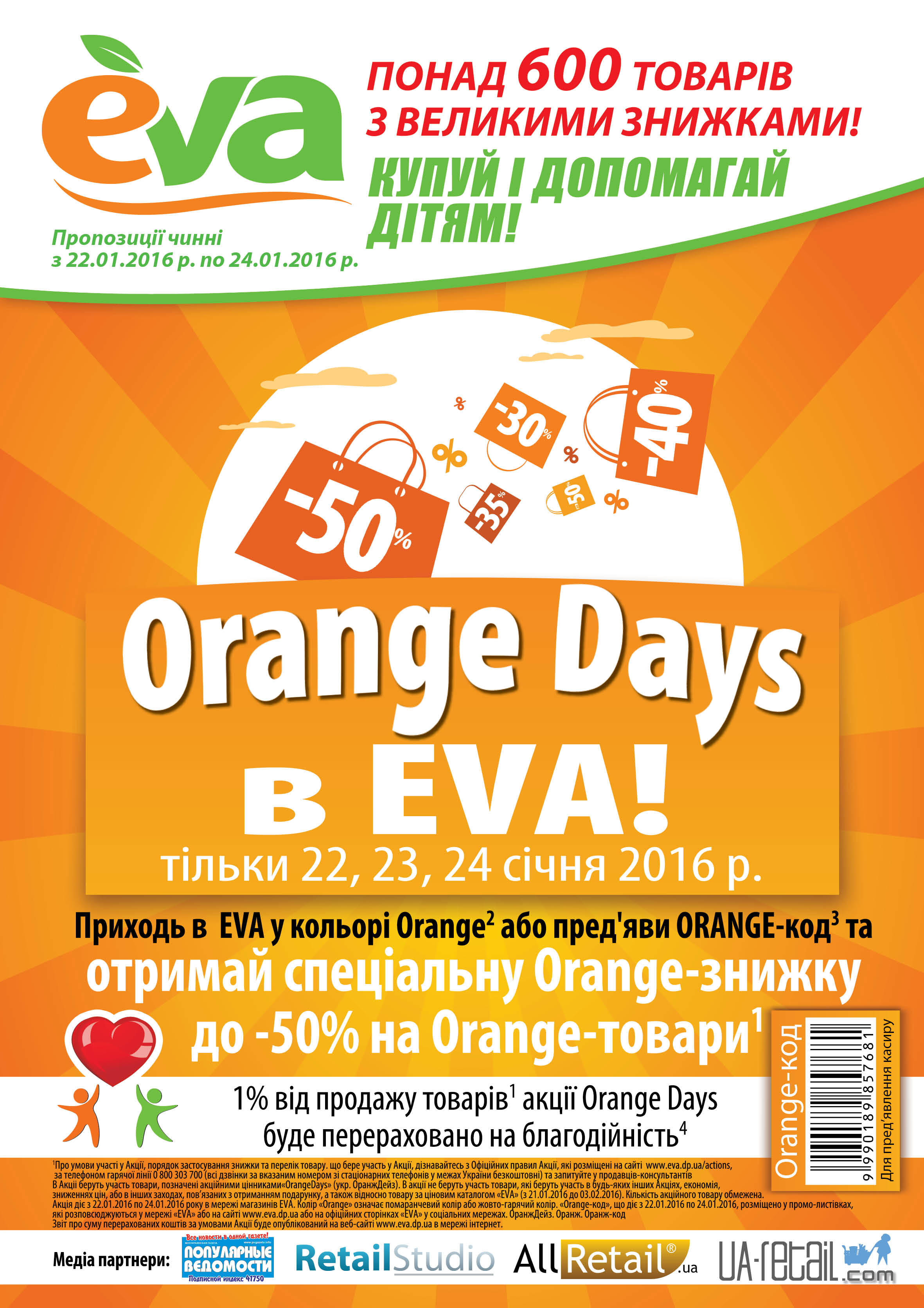 В Украине продолжается проект «Orange Days». В течение трех дней, 22,23,24 января покупатели национальной сети EVA, совершая покупки, одновременно собирают средства для оказания помощи новорожденным детям Украины. По условиям акции 1% от стоимости товаров, проданных в период проведения Оранжевых дней, перечисляется на закупку медицинского оборудования перинатальным центрам.